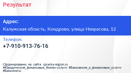 Результат по адресу Калужская область, Кондрово, улица Некрасова, 12 в дальнейшем Организация, размещена в следующих категориях: