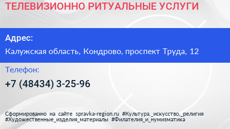 ТЕЛЕВИЗИОННО-РИТУАЛЬНЫЕ УСЛУГИ по адресу Калужская область, Кондрово, проспект Труда, 12 в дальнейшем Организация, размещена в следующих категориях: