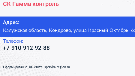 СК Гамма-контроль по адресу Калужская область, Кондрово, улица Красный Октябрь, 6а в дальнейшем Организация, размещена в следующих категориях: