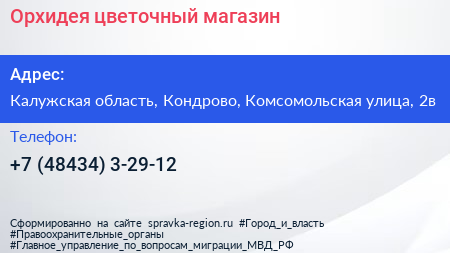 Орхидея, цветочный магазин по адресу Калужская область, Кондрово, Комсомольская улица, 2в в дальнейшем Организация, размещена в следующих категориях:
