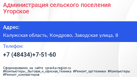 Администрация сельского поселения Угорское по адресу Калужская область, Кондрово, Заводская улица, 8 в дальнейшем Организация, размещена в следующих категориях: