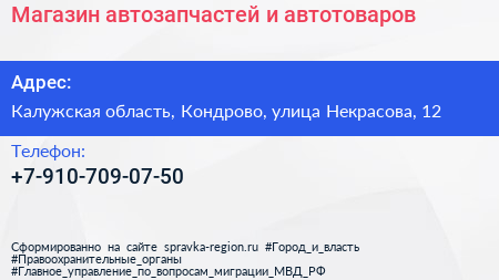 Магазин автозапчастей и автотоваров по адресу Калужская область, Кондрово, улица Некрасова, 12 в дальнейшем Организация, размещена в следующих категориях: