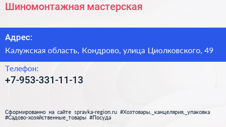 Шиномонтажная мастерская по адресу Калужская область, Кондрово, улица Циолковского, 49 в дальнейшем Организация, размещена в следующих категориях:
