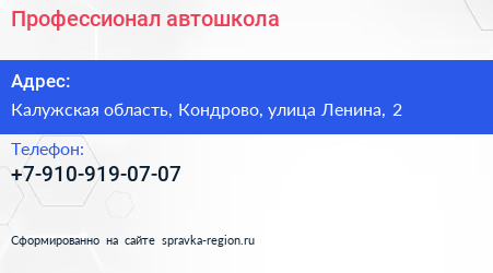 Профессионал, автошкола по адресу Калужская область, Кондрово, улица Ленина, 2 в дальнейшем Организация, размещена в следующих категориях: