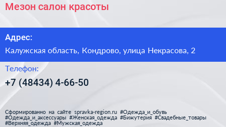 Мезон, салон красоты по адресу Калужская область, Кондрово, улица Некрасова, 2 в дальнейшем Организация, размещена в следующих категориях: