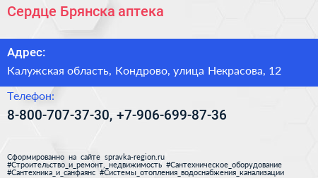 Сердце Брянска, аптека по адресу Калужская область, Кондрово, улица Некрасова, 12 в дальнейшем Организация, размещена в следующих категориях: