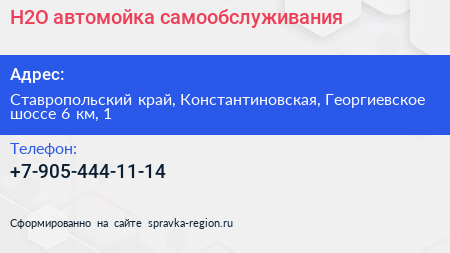 H2O, автомойка самообслуживания по адресу Ставропольский край, Константиновская, Георгиевское шоссе 6 км, 1 в дальнейшем Организация, размещена в следующих категориях: