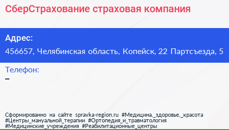СберСтрахование, страховая компания по адресу 456657, Челябинская область, Копейск, 22 Партсъезда, 5 в дальнейшем Организация, размещена в следующих категориях: