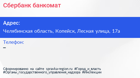 Сбербанк, банкомат по адресу Челябинская область, Копейск, Лесная улица, 17а в дальнейшем Организация, размещена в следующих категориях: