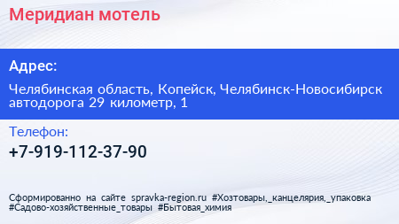 Меридиан, мотель по адресу Челябинская область, Копейск, Челябинск-Новосибирск автодорога 29 километр, 1 в дальнейшем Организация, размещена в следующих категориях: