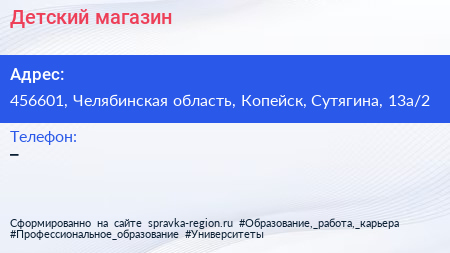Детский магазин по адресу 456601, Челябинская область, Копейск, Сутягина, 13а/2 в дальнейшем Организация, размещена в следующих категориях: