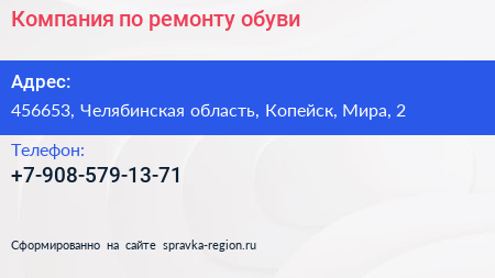 Компания по ремонту обуви по адресу 456653, Челябинская область, Копейск, Мира, 2 в дальнейшем Организация, размещена в следующих категориях: