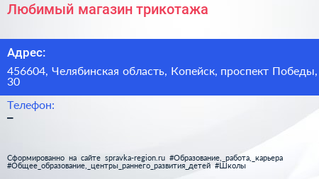 Любимый, магазин трикотажа по адресу 456604, Челябинская область, Копейск, проспект Победы, 30 в дальнейшем Организация, размещена в следующих категориях:
