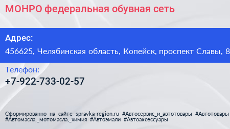 МОНРО, федеральная обувная сеть по адресу 456625, Челябинская область, Копейск, проспект Славы, 8 в дальнейшем Организация, размещена в следующих категориях: