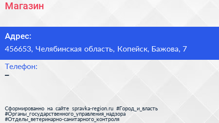 Магазин по адресу 456653, Челябинская область, Копейск, Бажова, 7 в дальнейшем Организация, размещена в следующих категориях: