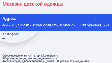 Магазин детской одежды по адресу 456621, Челябинская область, Копейск, Октябрьская, 27Б в дальнейшем Организация, размещена в следующих категориях: