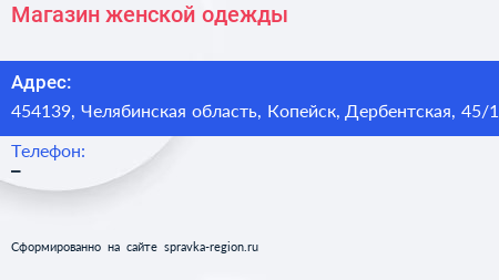 Магазин женской одежды по адресу 454139, Челябинская область, Копейск, Дербентская, 45/1 в дальнейшем Организация, размещена в следующих категориях: