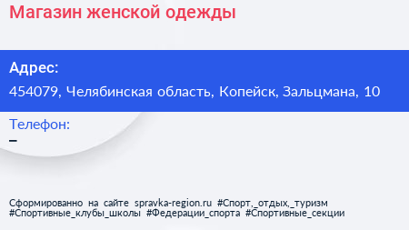 Магазин женской одежды по адресу 454079, Челябинская область, Копейск, Зальцмана, 10 в дальнейшем Организация, размещена в следующих категориях: