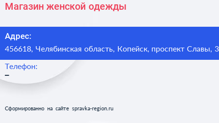 Магазин женской одежды по адресу 456618, Челябинская область, Копейск, проспект Славы, 3 в дальнейшем Организация, размещена в следующих категориях: