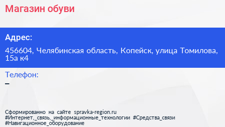 Магазин обуви по адресу 456604, Челябинская область, Копейск, улица Томилова, 15а к4 в дальнейшем Организация, размещена в следующих категориях: