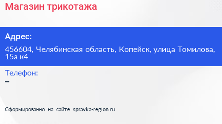 Магазин трикотажа по адресу 456604, Челябинская область, Копейск, улица Томилова, 15а к4 в дальнейшем Организация, размещена в следующих категориях: