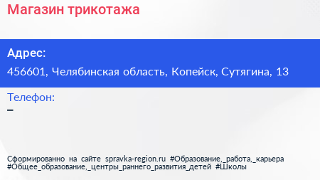 Магазин трикотажа по адресу 456601, Челябинская область, Копейск, Сутягина, 13 в дальнейшем Организация, размещена в следующих категориях: