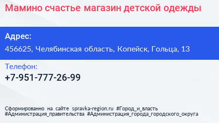 Мамино счастье, магазин детской одежды по адресу 456625, Челябинская область, Копейск, Гольца, 13 в дальнейшем Организация, размещена в следующих категориях: