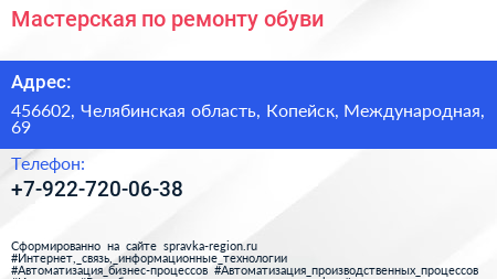 Мастерская по ремонту обуви по адресу 456602, Челябинская область, Копейск, Международная, 69 в дальнейшем Организация, размещена в следующих категориях:
