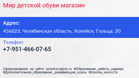 Мир детской обуви, магазин по адресу 456623, Челябинская область, Копейск, Гольца, 20 в дальнейшем Организация, размещена в следующих категориях: