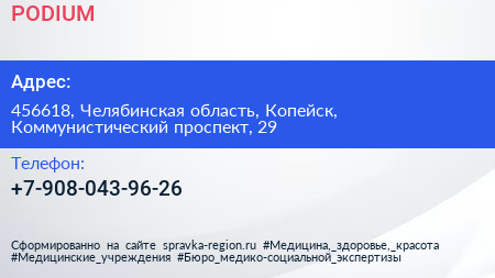 PODIUM по адресу 456618, Челябинская область, Копейск, Коммунистический проспект, 29 в дальнейшем Организация, размещена в следующих категориях: