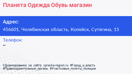 Планета Одежда Обувь, магазин по адресу 456601, Челябинская область, Копейск, Сутягина, 15 в дальнейшем Организация, размещена в следующих категориях: