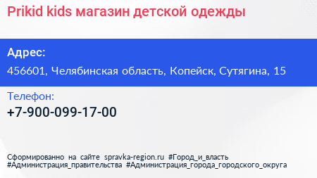 Prikid kids, магазин детской одежды по адресу 456601, Челябинская область, Копейск, Сутягина, 15 в дальнейшем Организация, размещена в следующих категориях: