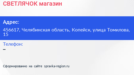 СВЕТЛЯЧОК, магазин по адресу 456617, Челябинская область, Копейск, улица Томилова, 15 в дальнейшем Организация, размещена в следующих категориях: