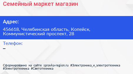 Семейный маркет, магазин по адресу 456618, Челябинская область, Копейск, Коммунистический проспект, 28 в дальнейшем Организация, размещена в следующих категориях: