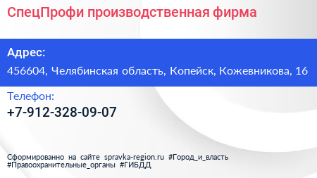СпецПрофи, производственная фирма по адресу 456604, Челябинская область, Копейск, Кожевникова, 16 в дальнейшем Организация, размещена в следующих категориях:
