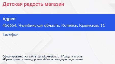 Детская радость, магазин по адресу 456654, Челябинская область, Копейск, Крымская, 11 в дальнейшем Организация, размещена в следующих категориях: