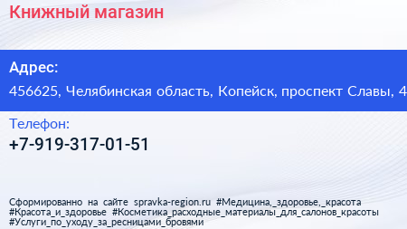 Книжный магазин по адресу 456625, Челябинская область, Копейск, проспект Славы, 4 в дальнейшем Организация, размещена в следующих категориях: