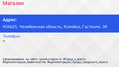 Магазин по адресу 456625, Челябинская область, Копейск, Гастелло, 34 в дальнейшем Организация, размещена в следующих категориях: