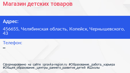 Магазин детских товаров по адресу 456655, Челябинская область, Копейск, Чернышевского, 43 в дальнейшем Организация, размещена в следующих категориях: