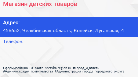 Магазин детских товаров по адресу 456652, Челябинская область, Копейск, Луганская, 4 в дальнейшем Организация, размещена в следующих категориях: