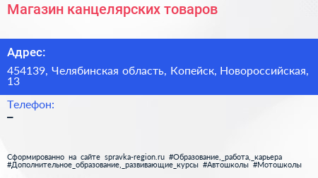 Магазин канцелярских товаров по адресу 454139, Челябинская область, Копейск, Новороссийская, 13 в дальнейшем Организация, размещена в следующих категориях: