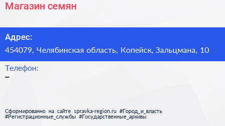 Магазин семян по адресу 454079, Челябинская область, Копейск, Зальцмана, 10 в дальнейшем Организация, размещена в следующих категориях: