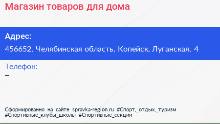 Магазин товаров для дома по адресу 456652, Челябинская область, Копейск, Луганская, 4 в дальнейшем Организация, размещена в следующих категориях: