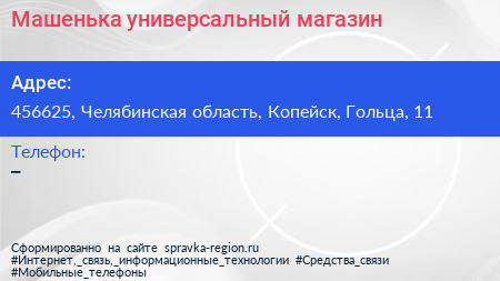 Машенька, универсальный магазин по адресу 456625, Челябинская область, Копейск, Гольца, 11 в дальнейшем Организация, размещена в следующих категориях: