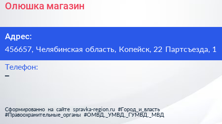 Олюшка, магазин по адресу 456657, Челябинская область, Копейск, 22 Партсъезда, 1 в дальнейшем Организация, размещена в следующих категориях: