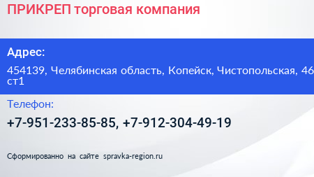 ПРИКРЕП, торговая компания по адресу 454139, Челябинская область, Копейск, Чистопольская, 46 ст1 в дальнейшем Организация, размещена в следующих категориях: