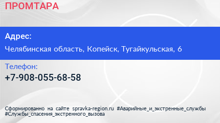 ПРОМТАРА по адресу Челябинская область, Копейск, Тугайкульская, 6 в дальнейшем Организация, размещена в следующих категориях: