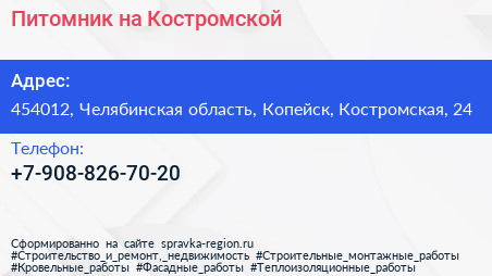 Питомник на Костромской по адресу 454012, Челябинская область, Копейск, Костромская, 24 в дальнейшем Организация, размещена в следующих категориях: