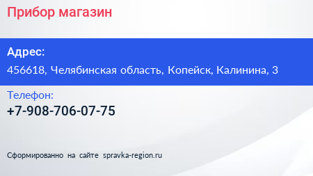 Прибор, магазин по адресу 456618, Челябинская область, Копейск, Калинина, 3 в дальнейшем Организация, размещена в следующих категориях:
