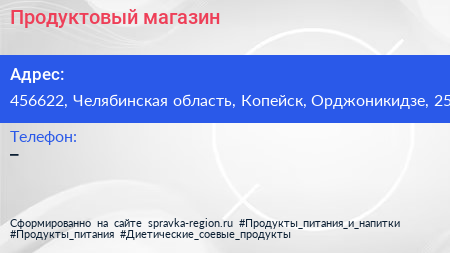Продуктовый магазин по адресу 456622, Челябинская область, Копейск, Орджоникидзе, 25 в дальнейшем Организация, размещена в следующих категориях:
